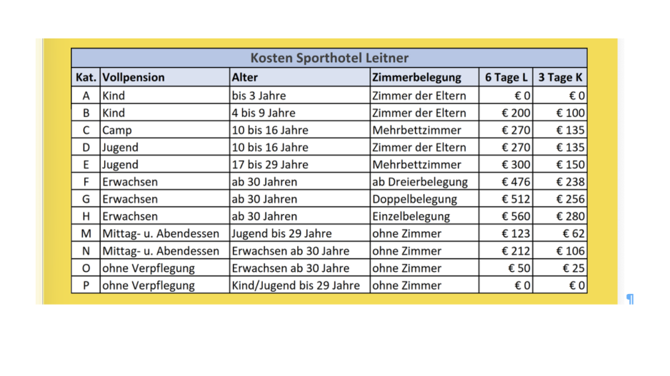 Vollpension gilt von Samstag Abendessen: Anreise ab14:00 Uhr bis Dienstag Mittagessen Kurzvariante (K) bzw. Freitag Mittagessen Langvariante(L) jeweils Abreise um 14:00 Uhr