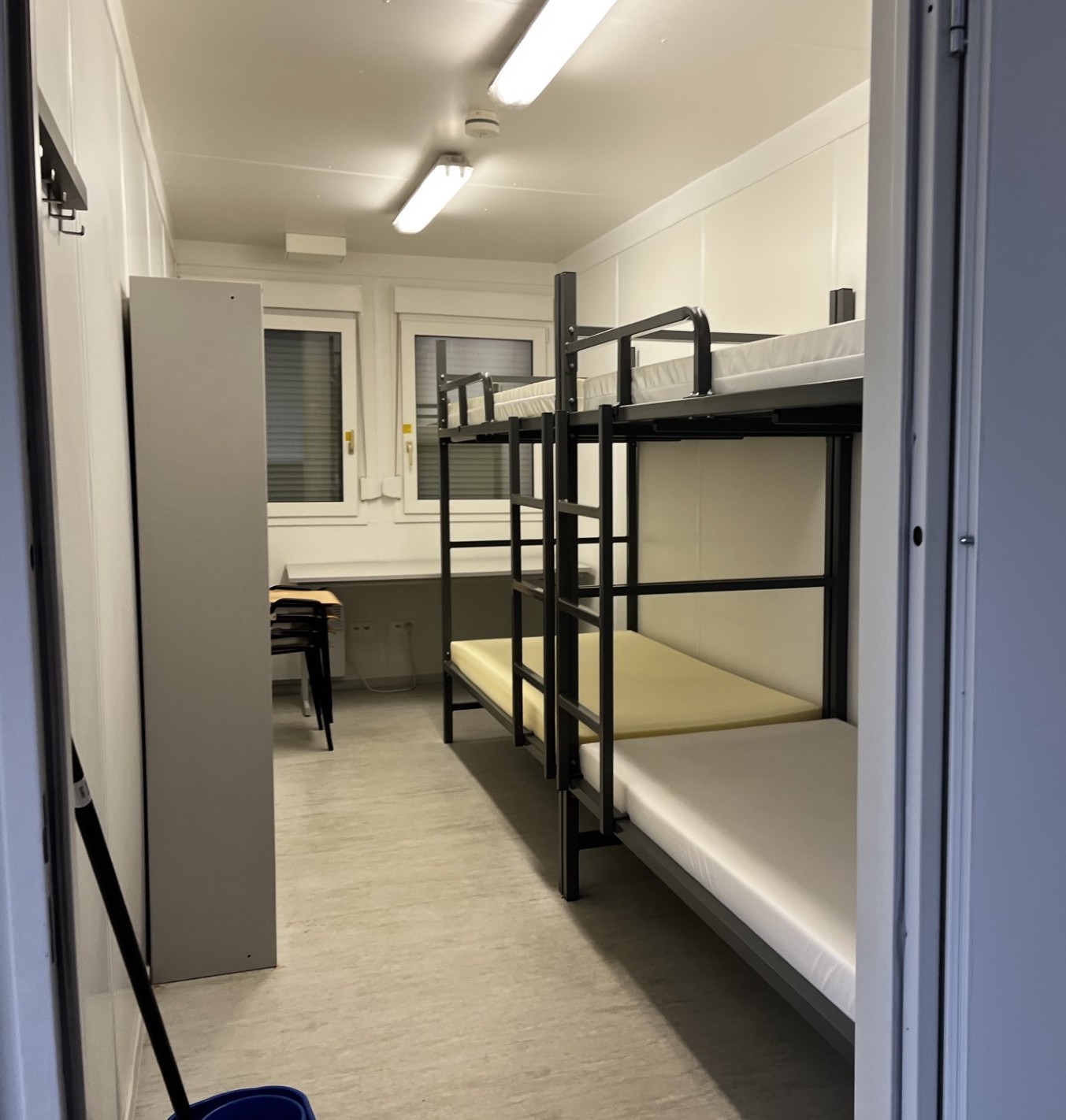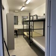 Blick in ein Zimmer für Familien in der temporären Container-Unterkunft Tiefenau für 600 ukrainische Schutzsuchende.